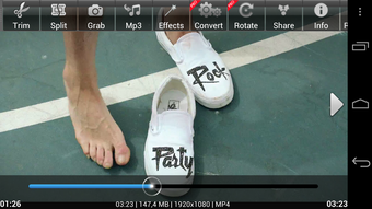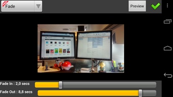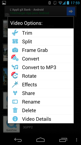 Video Trimmer AndroVid permet de couper des morceaux, séparer la vidéo en deux parties, capturer une image, extraire seulement le son, ajouter des filtres sur l'image et renommer le fichier. Parmi les effets à appliquer à la vidéo (ou filtres), il est possible d'ajouter un effet de miroir, un ton de négatif photo ou un filtre UV et enlever la piste audio.
