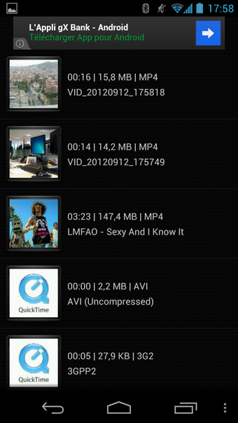 Video Trimmer AndroVid permet de travailler sur toutes les vidéos qui sont sur le smartphone, enregistrées avec celui-ci ou ajoutées via le PC. Les vidéos sont présentées les unes à la suite dans autres dans une interface sans fioritures.